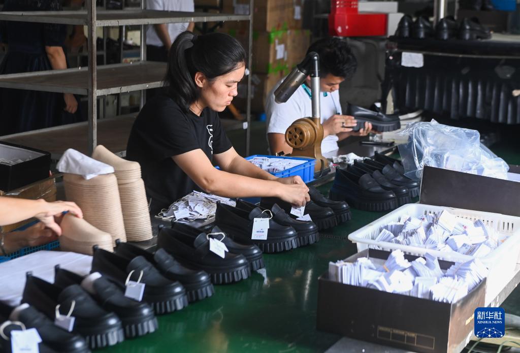 9月27日,在諸暨市姚江鎮一家鞋業企業內,工人在查驗剛生產完成的外貿鞋。