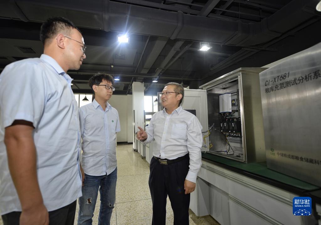 9月20日,在位于四川省成都市的中儲糧成都儲藏研究院,付鵬程(右)為團隊成員講解氮氣氣調控制柜安裝使用注意事項。