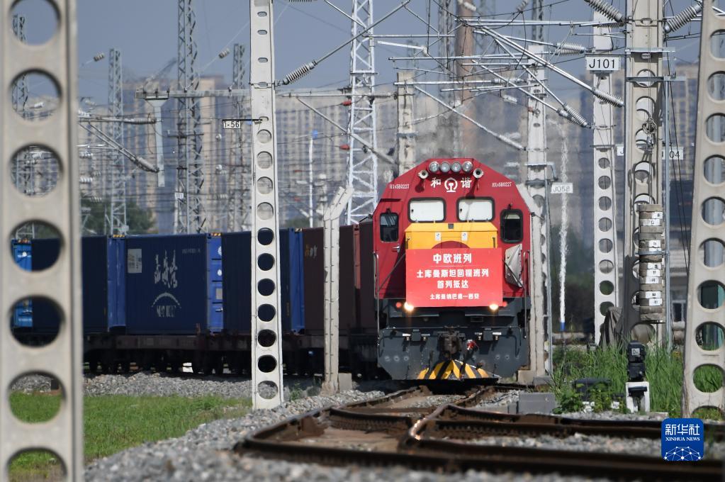 滿載土庫曼斯坦甘草中藥材原料的中歐班列回程列車抵達西安國際港站(2022年8月31日攝,無人機照片)。