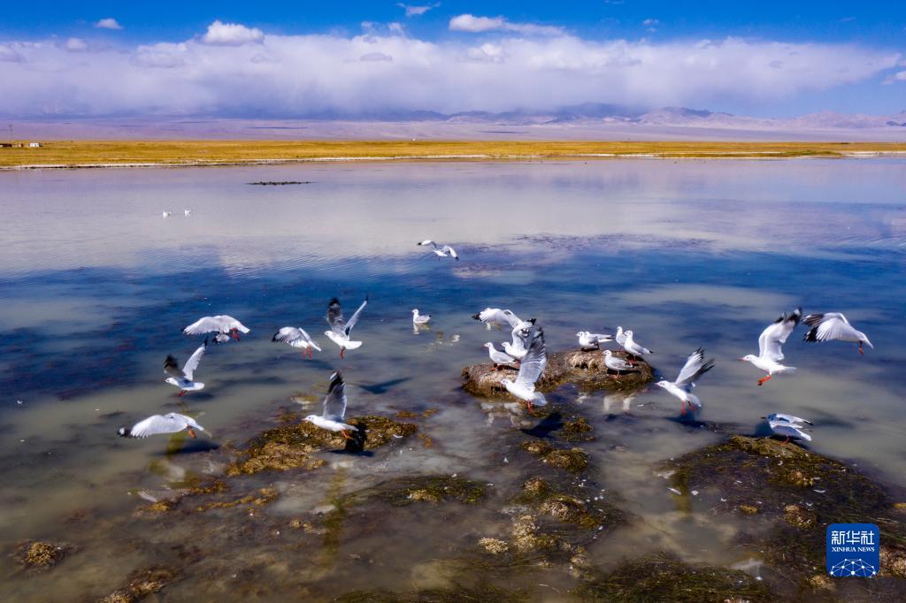 9月27日,紅嘴鷗在小蘇干湖上飛舞(無人機照片)。