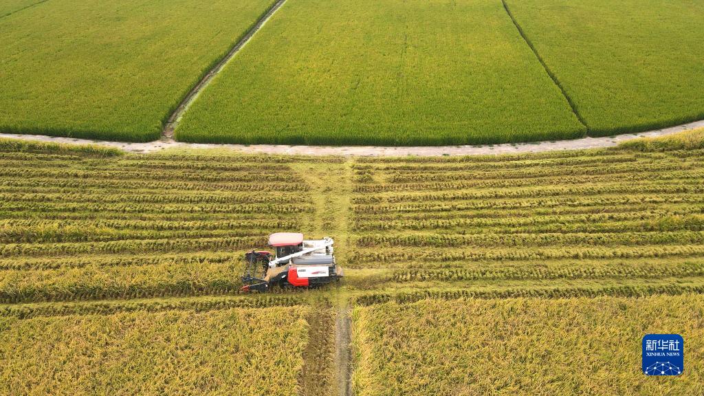 金秋時節,安徽省合肥市肥西縣花崗鎮河豐社區中稻陸續成熟,當地農民搶抓晴好天氣收割水稻,田間地頭一派豐收景象。