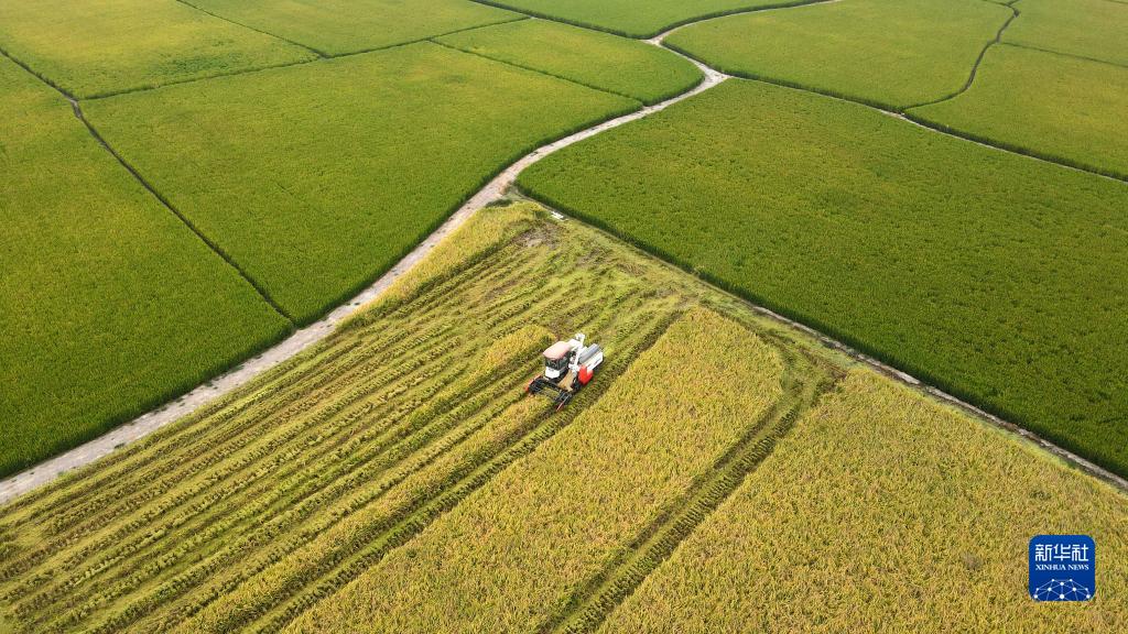 金秋時節,安徽省合肥市肥西縣花崗鎮河豐社區中稻陸續成熟,當地農民搶抓晴好天氣收割水稻,田間地頭一派豐收景象。