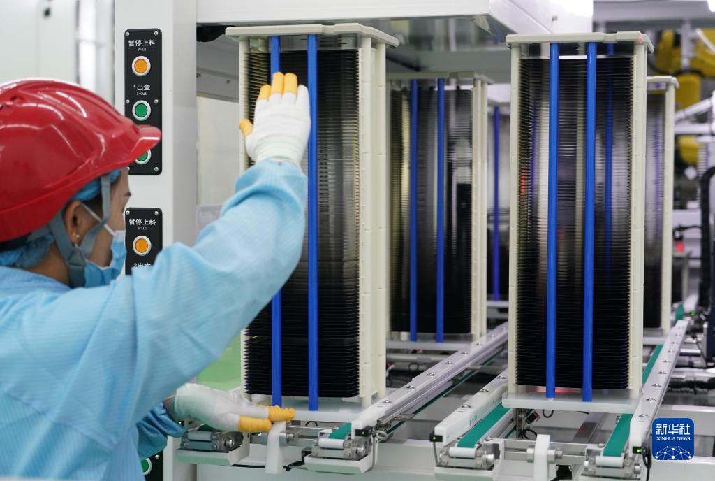 9月28日,工人在隆基綠能15GW高效單晶電池項目車間生產線上進行上料操作。