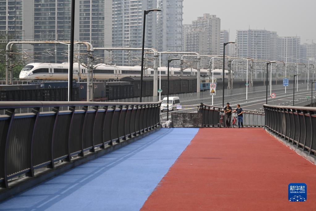 9月28日,市民在新彭埠大橋的慢行系統上推行自行車。