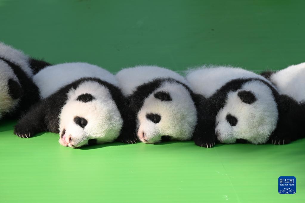 當日,為迎接即將到來的國慶佳節,成都大熊貓繁育研究基地內十余只2022級新生大熊貓寶寶一起亮相太陽產房。