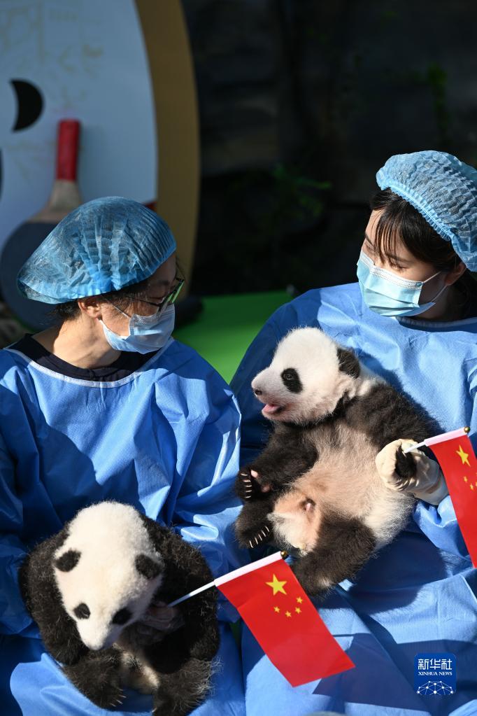 9月28日,成都大熊貓繁育研究基地工作人員抱著2022級新生大熊貓幼仔亮相太陽產(chǎn)房。