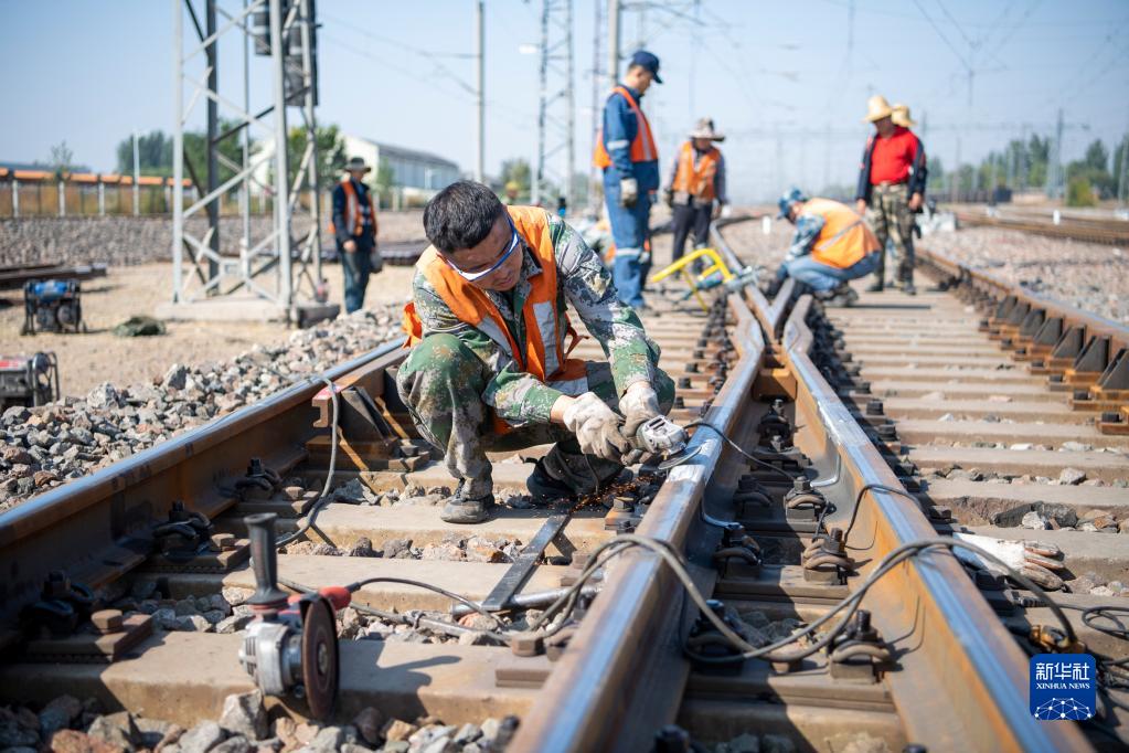9月28日,中國鐵路太原局集團有限公司大同工務段工人在大秦線湖東站進行施工作業。