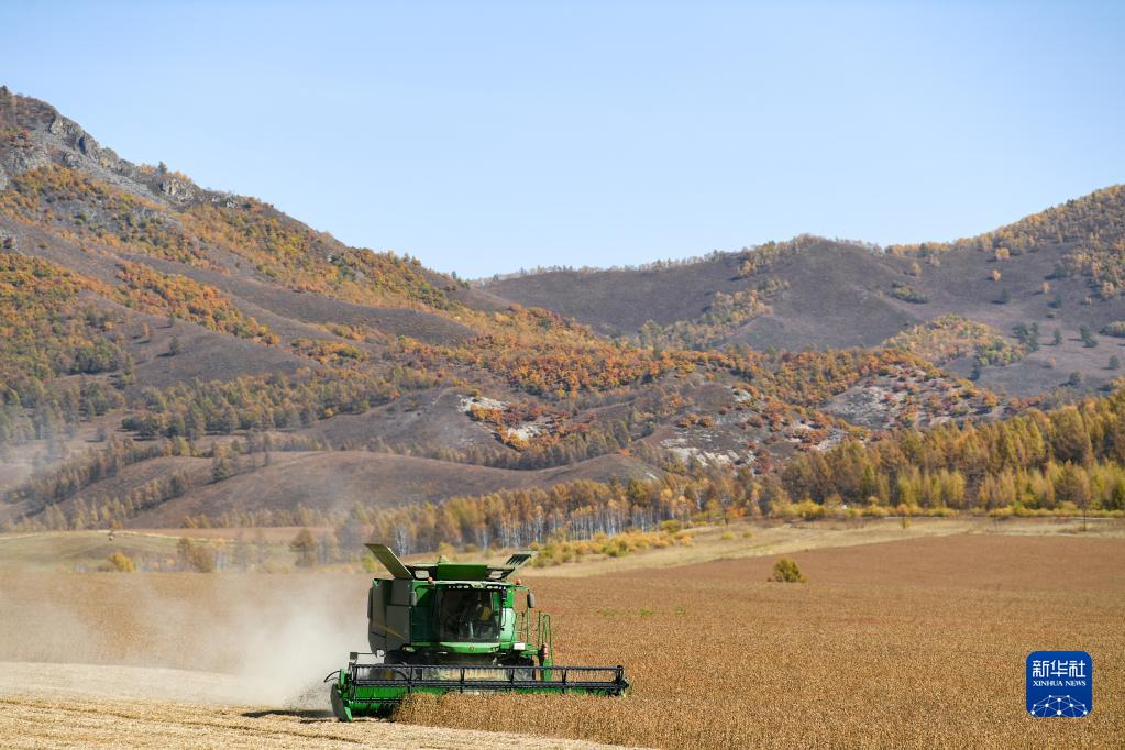 9月28日,在呼倫貝爾農墾綽爾河農牧場,工作人員駕駛收割機收獲大豆。