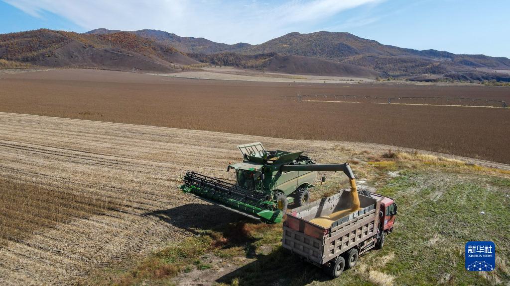 9月28日,在呼倫貝爾農墾綽爾河農牧場,工作人員駕駛農機將收獲的大豆裝入貨車(無人機照片)。
