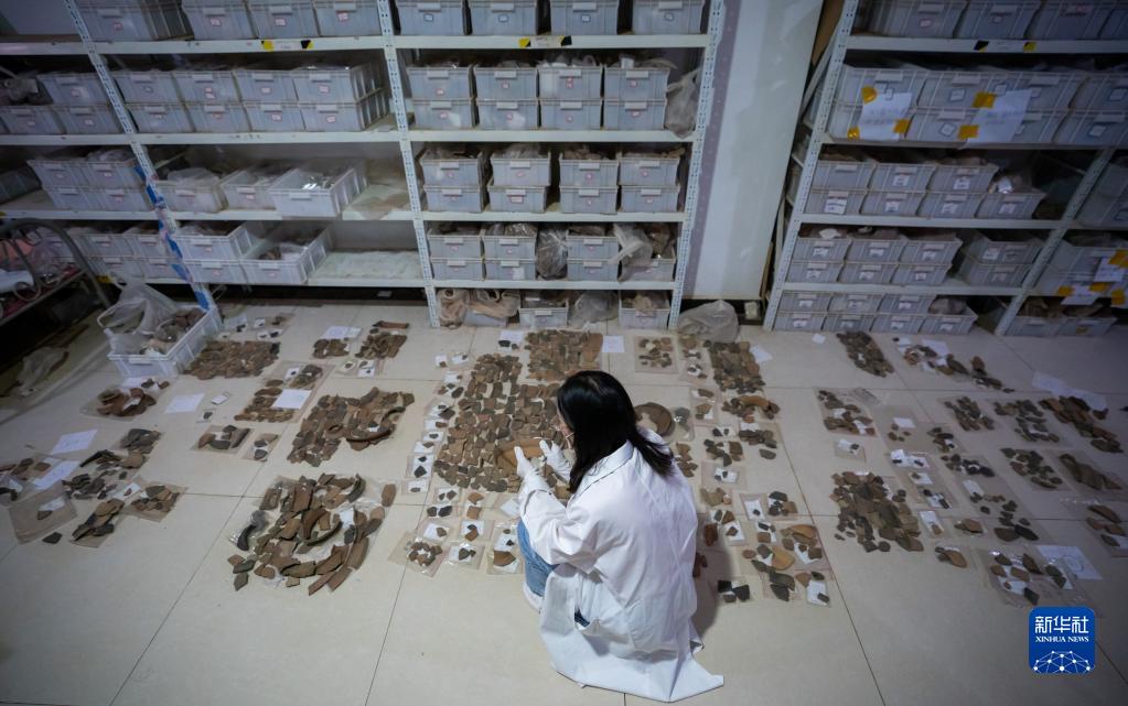 考古工作者在整理云南河泊所遺址出土的各類陶片(2022年9月21日攝)。