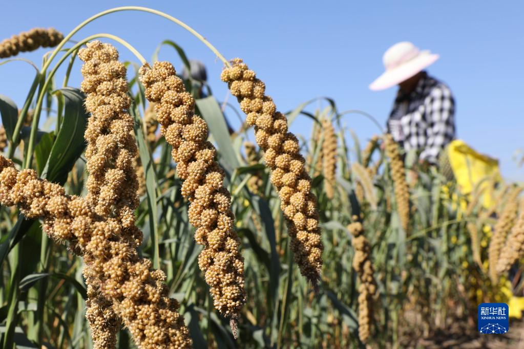 9月28日,河南省平頂山市寶豐縣商酒務鎮黃洼村農民在收獲谷子。