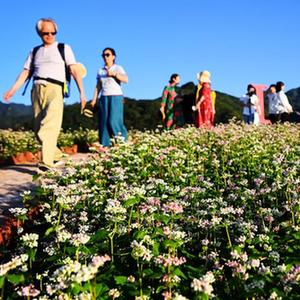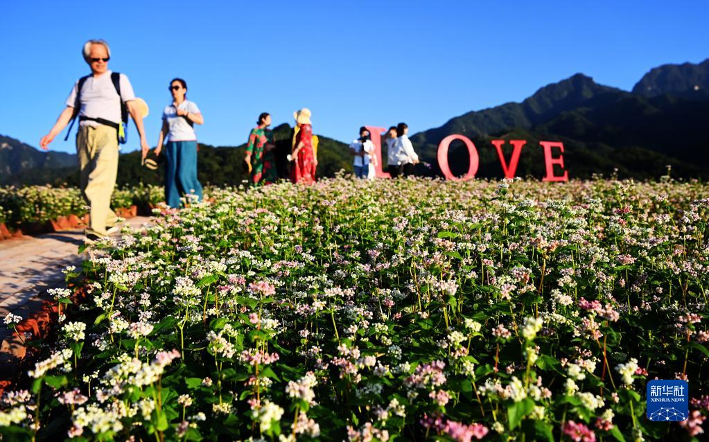 游人在陜西省西安市藍田縣九間房鎮峪口村蕎麥花海游覽(9月28日攝)。