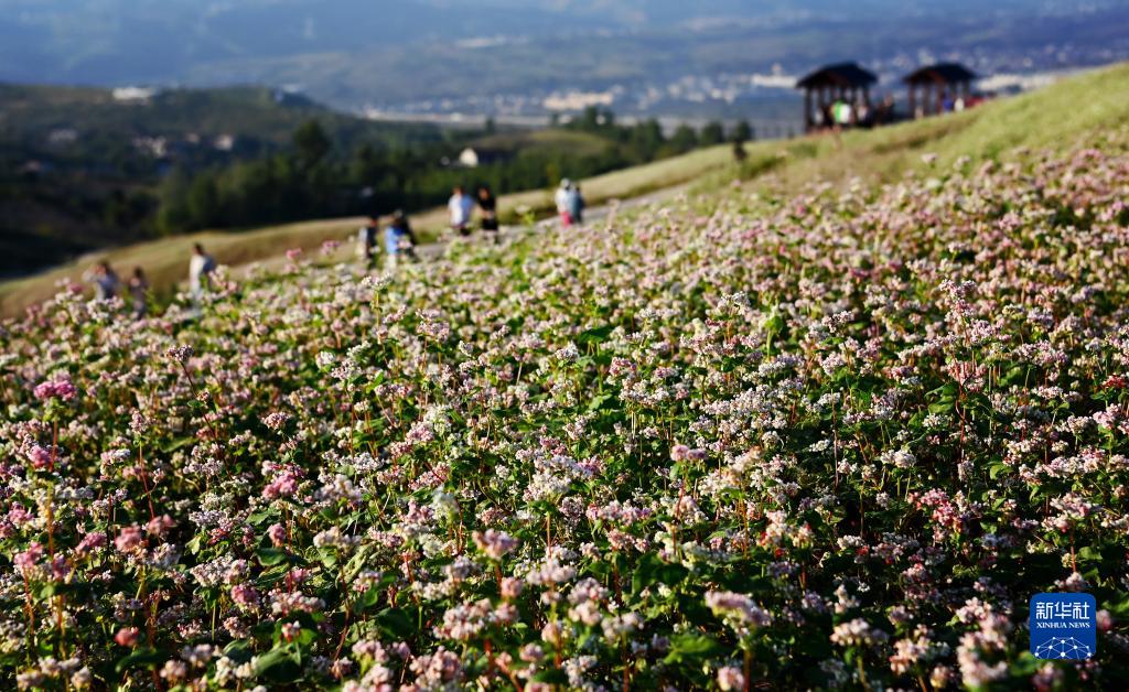 游人在陜西省西安市藍田縣九間房鎮峪口村蕎麥花海游覽(9月28日攝)。