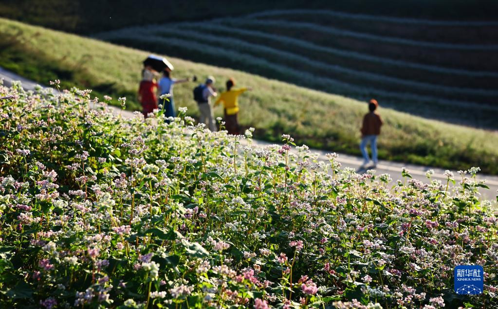 游人在陜西省西安市藍田縣九間房鎮峪口村蕎麥花海游覽(9月28日攝)。