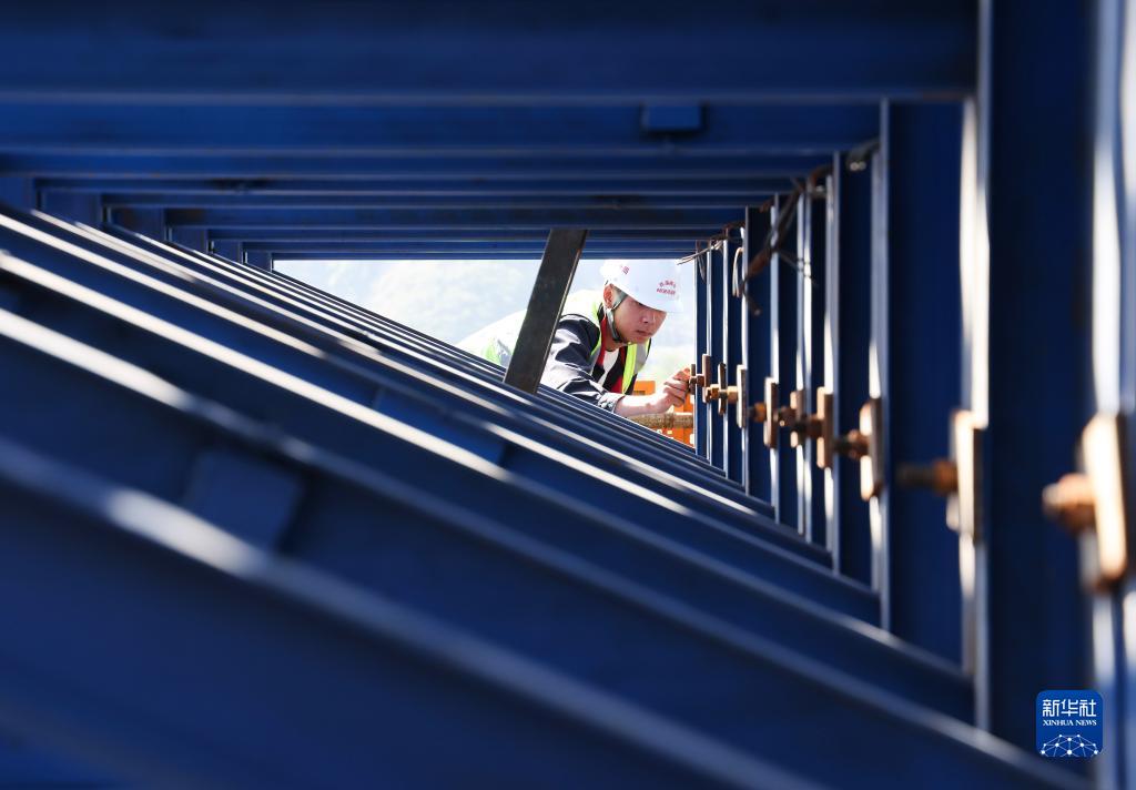 9月28日,中鐵二十局施工人員在位于延安市洛川縣的西延高鐵北洛河特大橋作業。