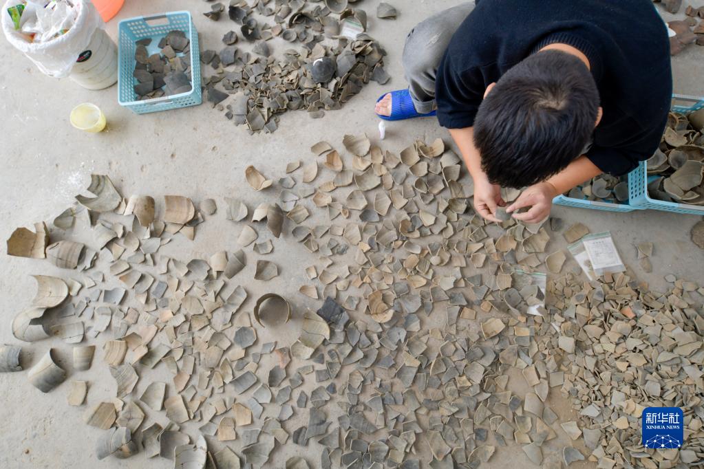 9月27日,考古發掘隊隊員王朋成在臨時庫房內,對此次考古發掘出土的陶片進行清點和拼對。