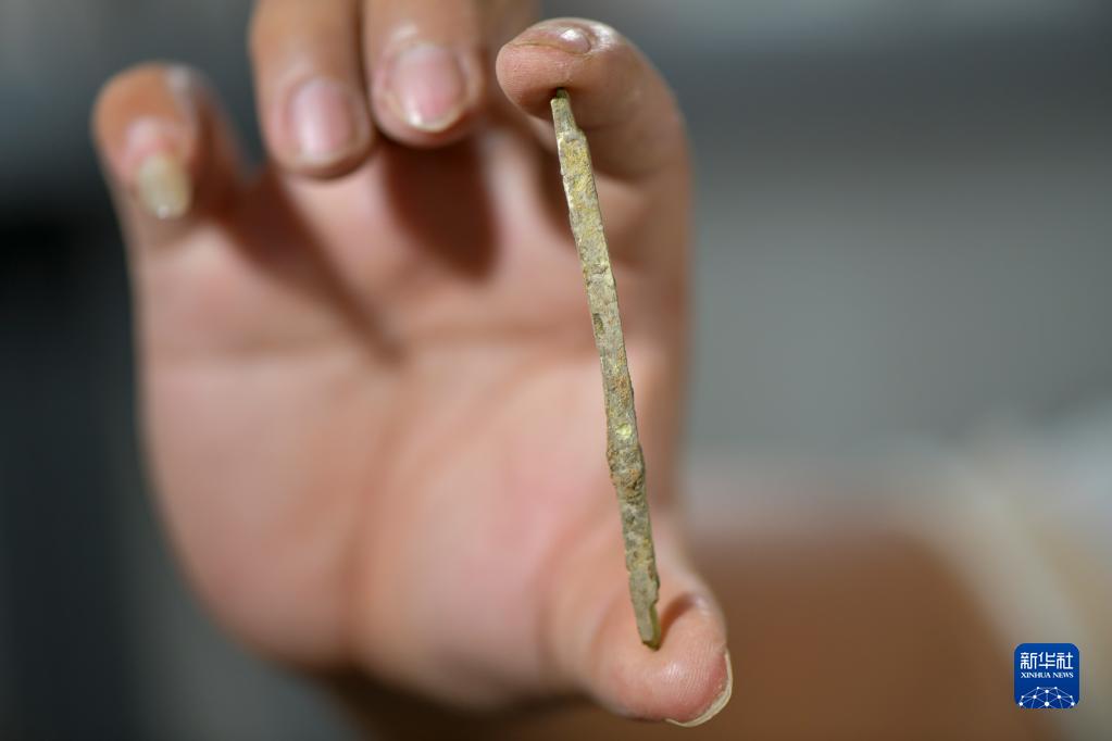 9月27日,考古發掘隊隊員程濤在臨時庫房內展示出土的銅簪。