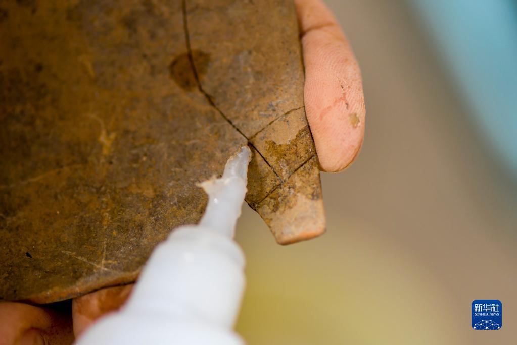 9月27日,考古發掘隊隊員王朋成在臨時庫房內,用膠水拼接出土的陶器。