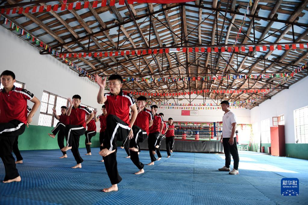 這是李迎港(右)在河南嵩山少林塔溝武校內給學生上課(2022年7月6日攝)。