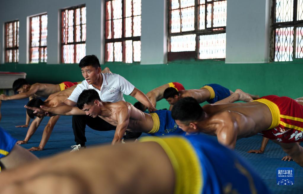 這是李迎港(上)在河南嵩山少林塔溝武校內給學生上課(2022年7月6日攝)。