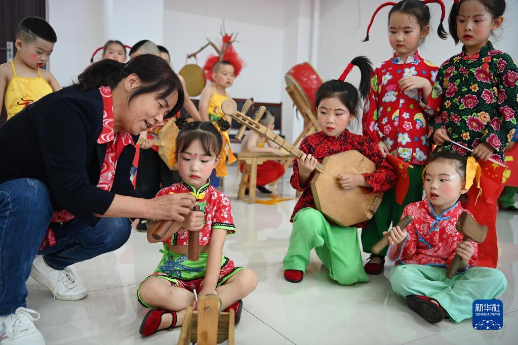 老腔藝人董轉玲(前左)在潼關縣城關北區幼兒園教孩子們使用樂器(9月27日攝)。