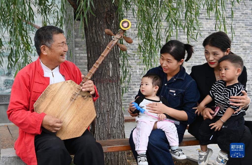 西北綜勘黃河老腔藝術(shù)團(tuán)主唱薛銀照(左一)在黃河岸邊向游人介紹“黃河老腔”知識(shí)(9月26日攝)。