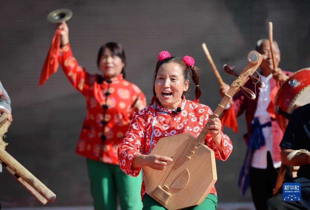西北綜勘黃河老腔藝術團藝人在潼關縣明德公園為群眾表演“黃河老腔”(9月26日攝)。