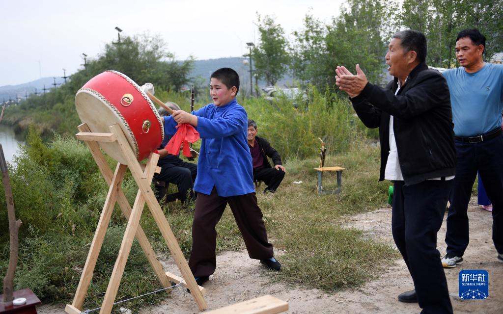 西北綜勘黃河老腔藝術團主唱薛銀照(右二)在指導秦東鎮濱河小學學生練習擊鼓(9月27日攝)。