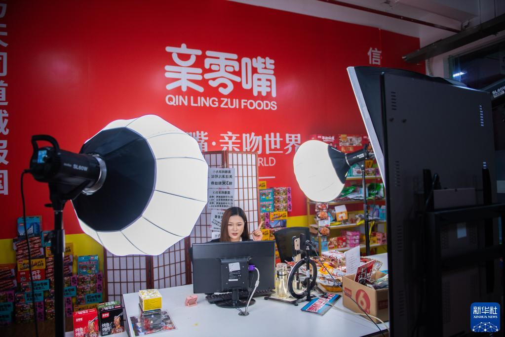 9月29日,在位于常德科技創(chuàng)新創(chuàng)業(yè)孵化產(chǎn)業(yè)園的湖南親零嘴食品有限公司,工作人員直播推銷零食。