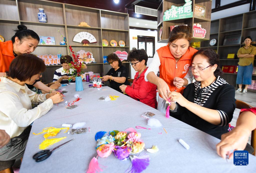 9月29日,在愛山街道衣裳街社區,“幸福鄰里”志愿者和老年居民共同制作茱萸香囊。