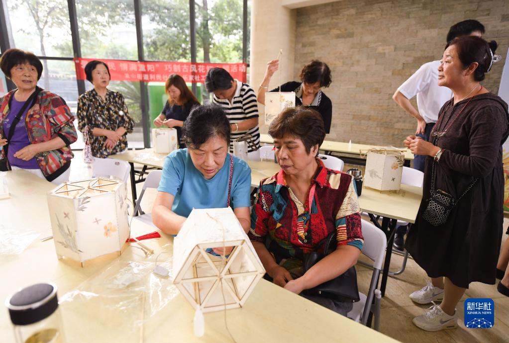 9月29日,在愛山街道利民社區,老年居民參加花燈制作。