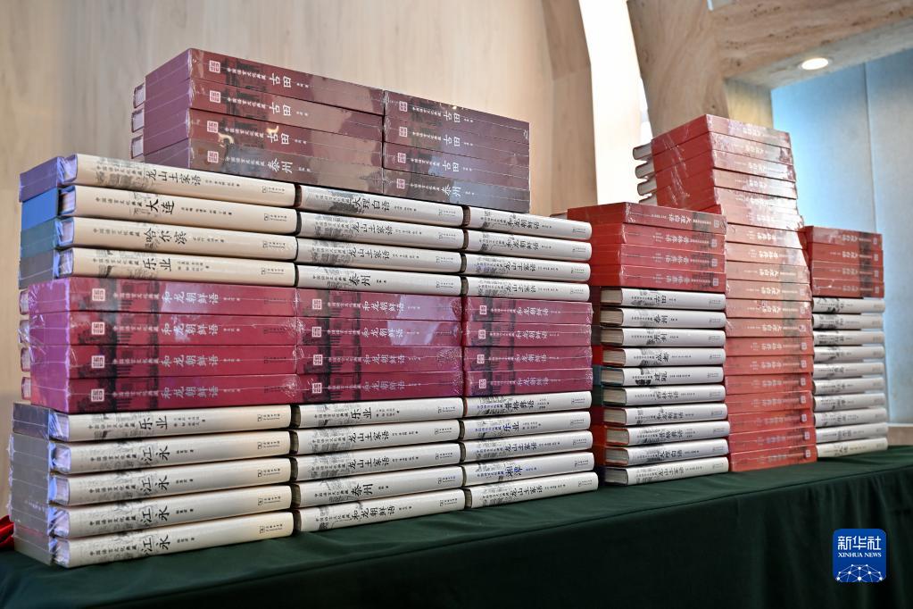 這是現(xiàn)場擺放的中國語言資源保護(hù)工程成果《中國語言文化典藏》第二輯20冊(cè)的相關(guān)書籍(9月29日攝)。