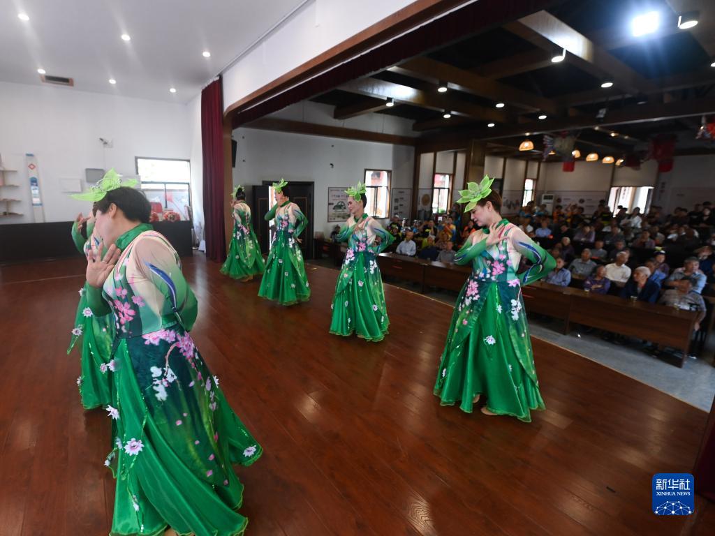 9月30日,老人們在杭州市臨安區河橋鎮河橋村文化禮堂觀看“柳溪暖陽”黨員助老志愿服務隊編排的節目。
