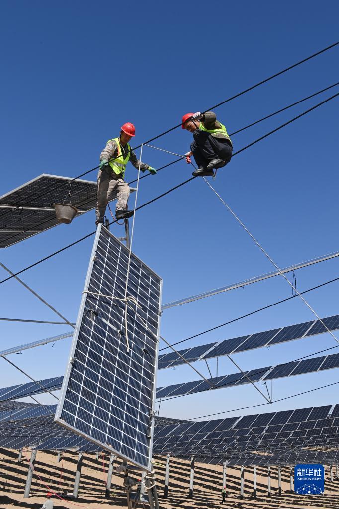 9月29日,在位于甘肅省武威市涼州區的甘肅武威50萬千瓦立體光伏治沙產業化示范項目建設現場,施工人員在吊裝光伏板。