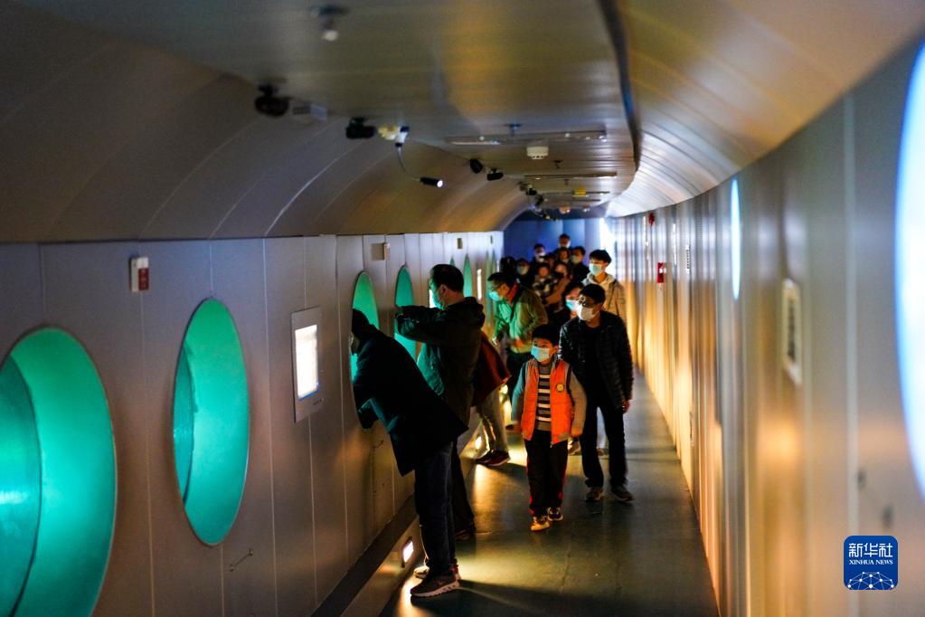 游客在重慶白鶴梁水下博物館的水下參觀廊道內,通過觀景窗觀看保護罩內的白鶴梁題刻(2021年2月21日攝)。