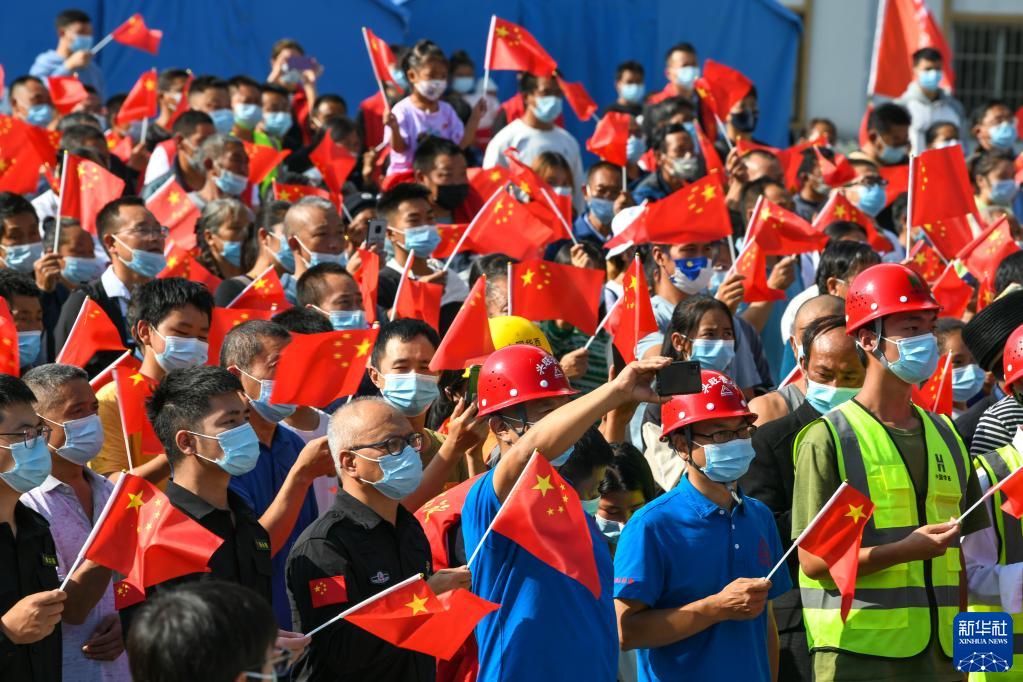 10月1日,在四川省甘孜州瀘定縣得妥鎮天池山村繁榮集中過渡安置點,人們在升國旗儀式后揮舞國旗。