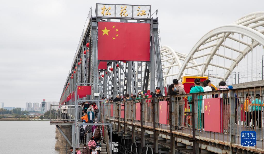 10月1日,市民在哈爾濱市濱州鐵路橋上游覽。