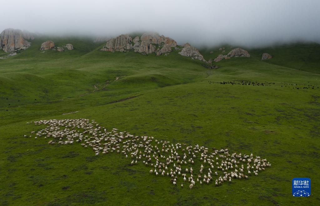 在四川省若爾蓋縣麥溪鄉(xiāng)黑河牧場上,牛羊成群(2022年7月25日攝,無人機照片)。