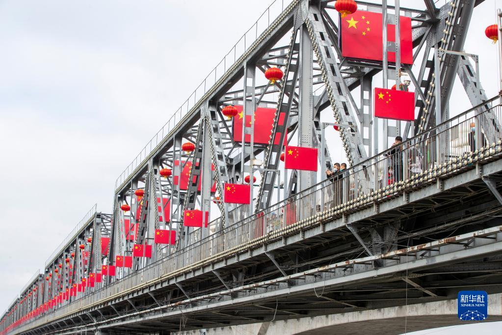 10月1日,市民在黑龍江省哈爾濱市濱州鐵路橋上游覽。