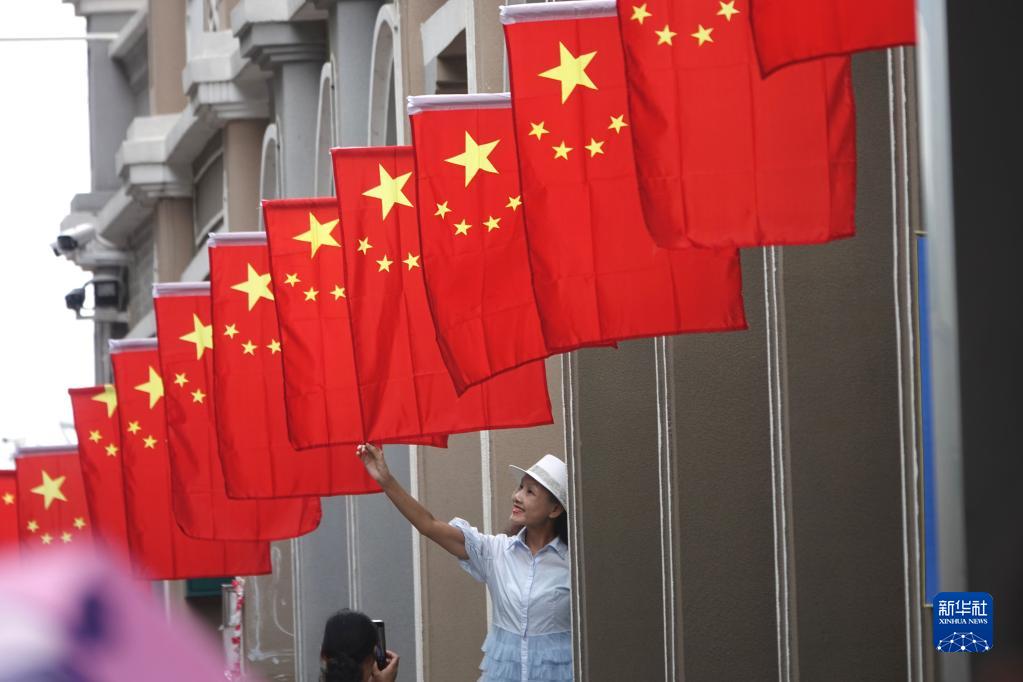 10月1日,一名市民在廣西南寧市朝陽(yáng)廣場(chǎng)步行街與懸掛的國(guó)旗合影。