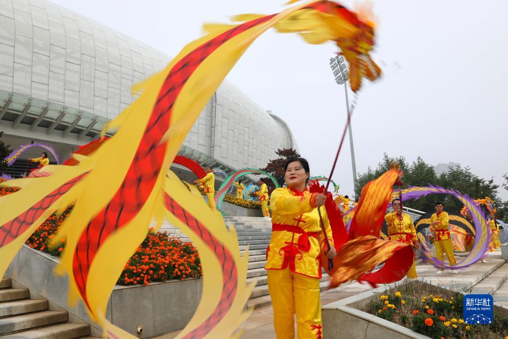 10月1日,在江蘇省寶應縣生態體育公園,市民舞起彩龍,歡度國慶。