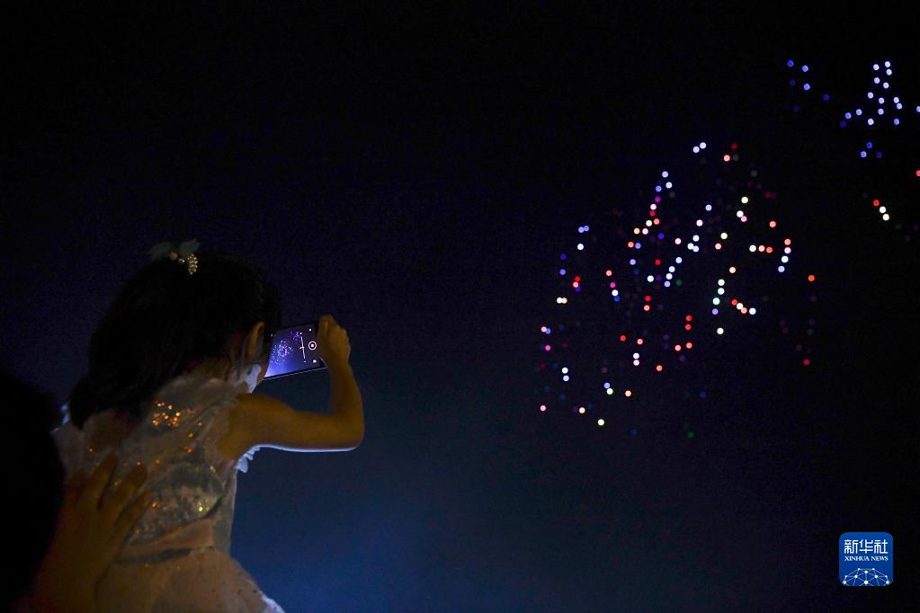 10月1日,在安徽省蕪湖市方特東方神畫(huà)游樂(lè)園,小朋友在拍攝無(wú)人機(jī)燈光秀。