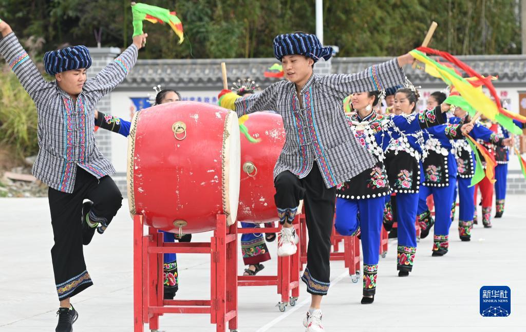 10月1日,苗族同胞在貴州省銅仁市松桃苗族自治縣正大鎮麻塘村打花鼓,歡度國慶。