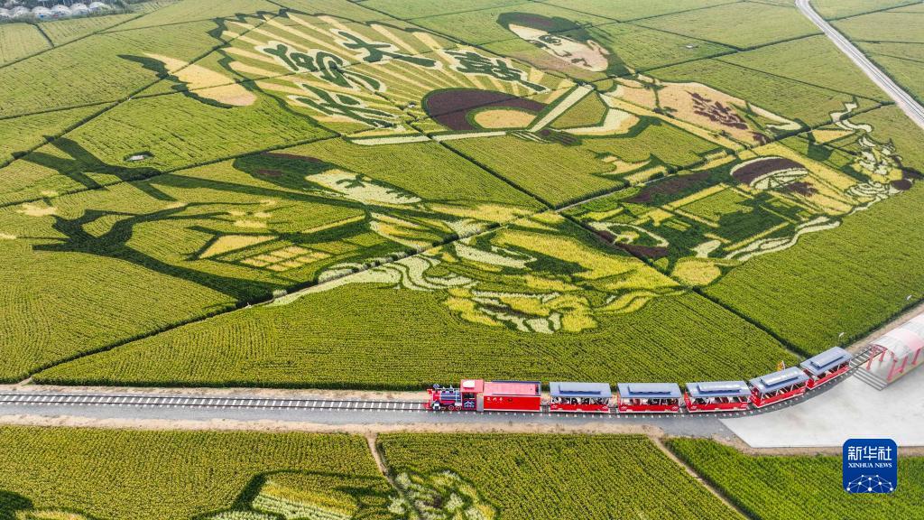 10月1日,游客乘坐小火車在河北省遵化市團瓢莊鄉山里各莊村稻田畫景區賞景(無人機照片)。