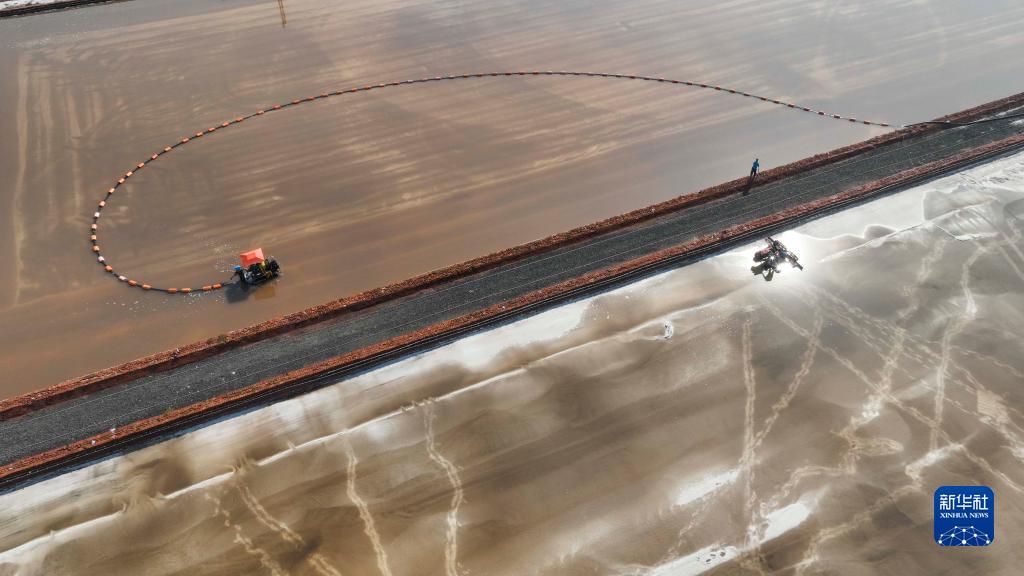 9月27日,工人在唐山海港經(jīng)濟(jì)開發(fā)區(qū)長(zhǎng)蘆大清河鹽場(chǎng)收獲秋鹽(無人機(jī)照片)。