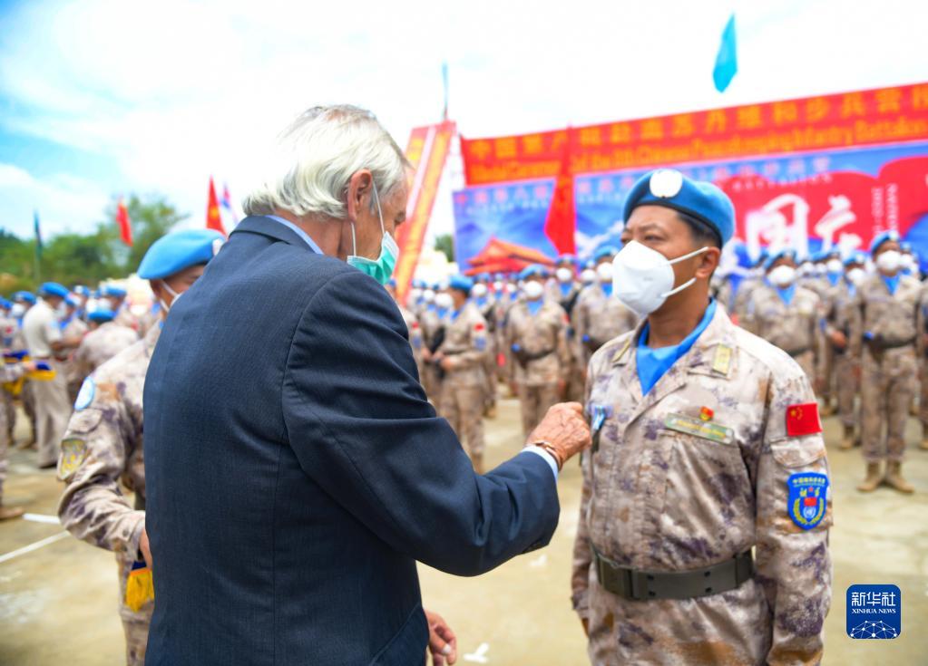 9月30日,在聯合國駐南蘇丹特派團超級營地,聯合國秘書長特別代表兼聯南蘇團團長尼古拉斯·海瑟姆為中國維和官兵授勛。