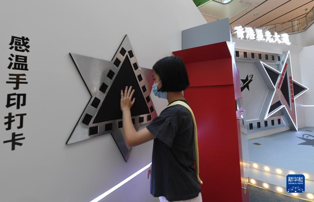 10月1日,市民在“再遇@香港”展覽上體驗星光大道場景下的感溫手印打卡互動游戲。