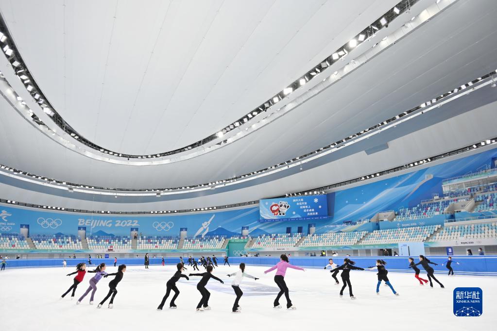 10月1日,青少年在“冰絲帶”內(nèi)參加花樣滑冰培訓(xùn)。