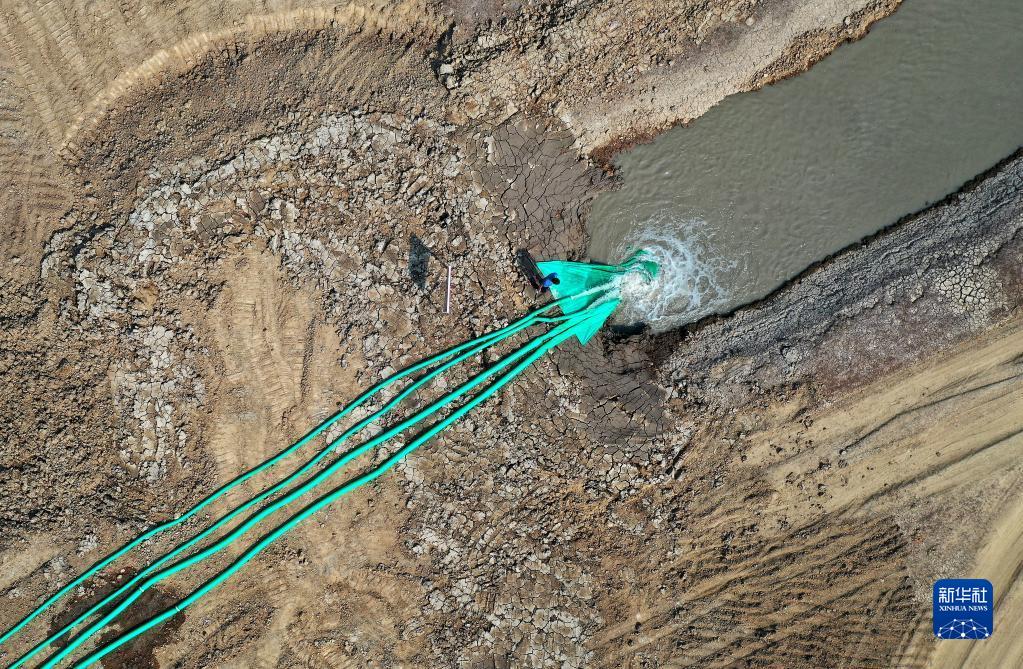 在江西省都昌縣,都昌縣候鳥自然保護區的工作人員用水泵將鄱陽湖主航道的水抽至人工水渠,然后輸入至碟形湖中(9月28日攝,無人機照片)。