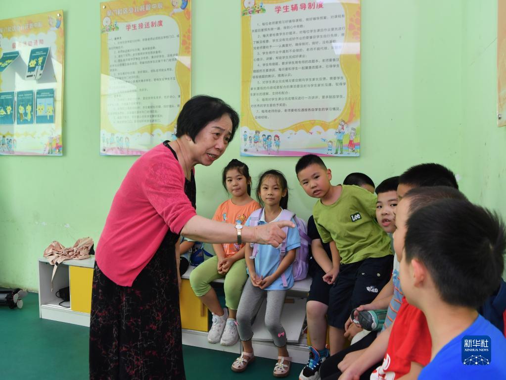 在福建省福州市軍門社區少兒托管中心,林丹與放學歸來的孩子們交流(2022年9月14日攝)。